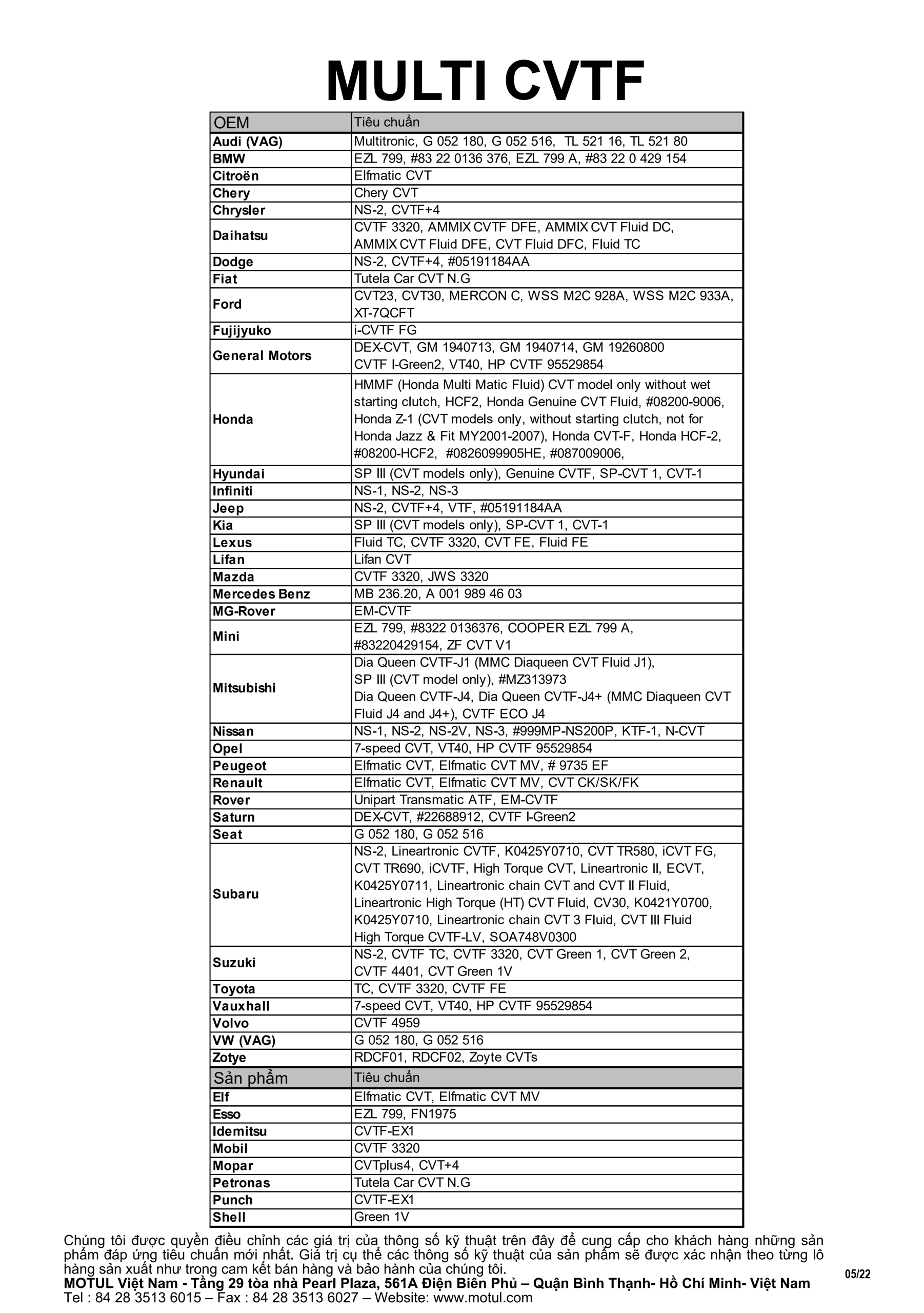 - MOTUL MULTI CVTF là dầu hộp số vô cấp CVT công nghệ cao dành cho hộp số CVT trang bị trên xe hơi với thiết kế dây đai và xích truyền động.